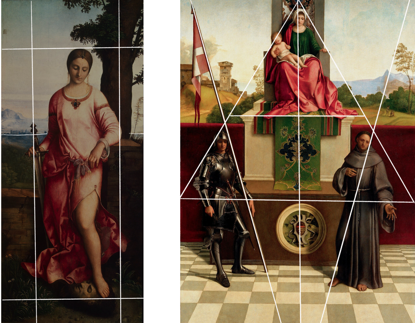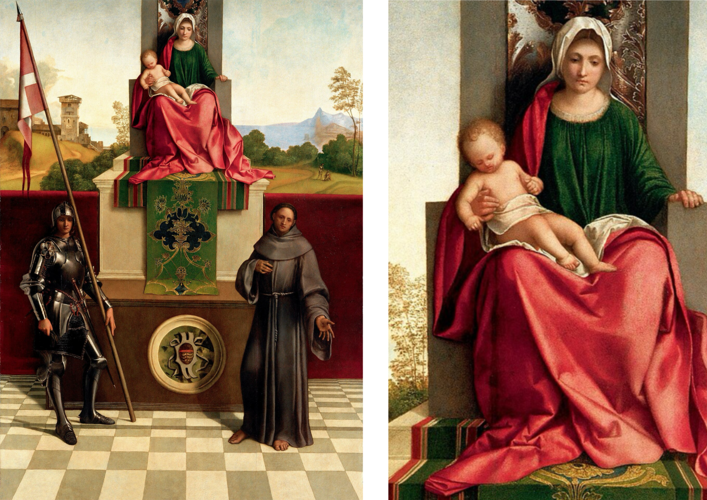 В «Мадонне Кастельфранко» симметричная треугольная композиция с тщательно выстроенным пространством. Образ героини сочетает женственность и героическое начало.