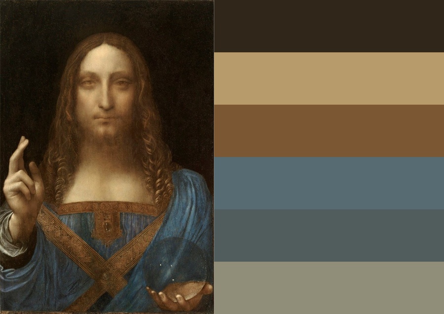 В картине «Спаситель мира» лазурно-голубые тона одеяния Христа и телесно-охристые тона как бы сливаются с прозрачной сферой в руке, демонстрируя мастерство да Винчи работы с лессировками.