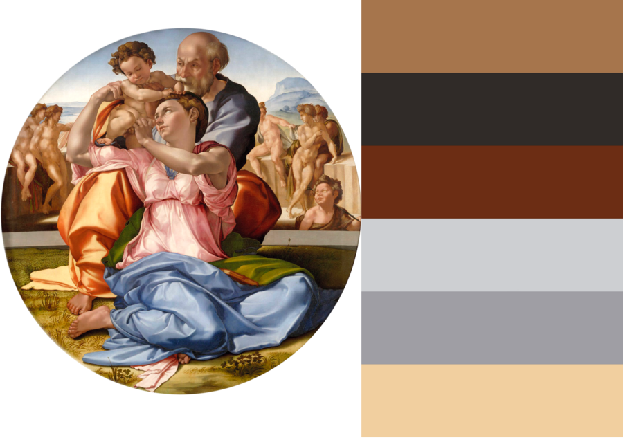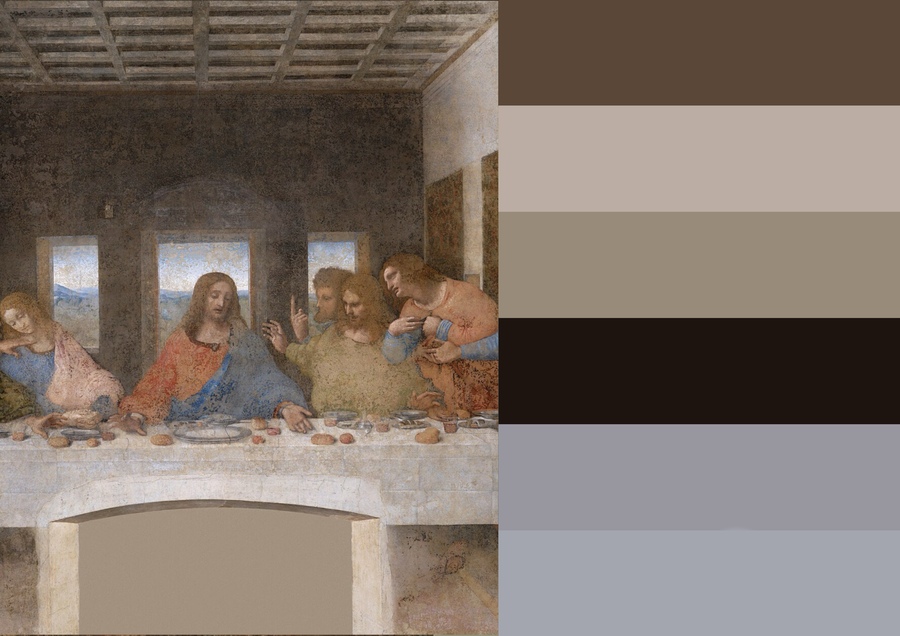 Стоит отметить, что внизу композиции находятся самые тёмные цвета работы. Далее (в центре) самые светлые цвета, чтобы подчеркнуть божественность героев. Затем снова уход в более тёмные оттенки.