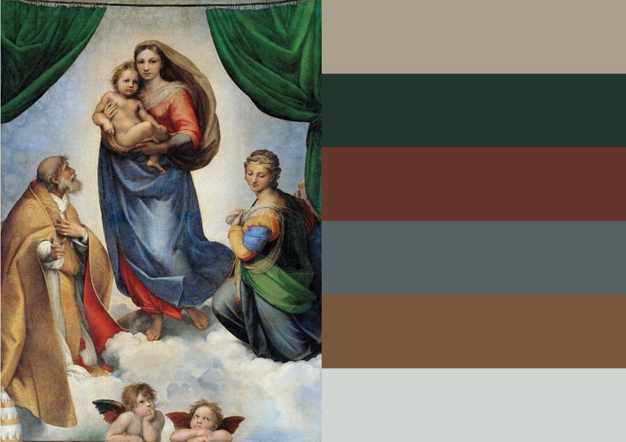 «Сикстинская Мадонна» демонстрирует символическое понимание цвета: синий плащ Богоматери означает небесную чистоту, красное одеяние — символ страстей Христовых. Цвет здесь несет как эстетическую, так и смысловую нагрузку. Он усиливает монументальность и ясность формы, не отвлекая на себя основное внимание.