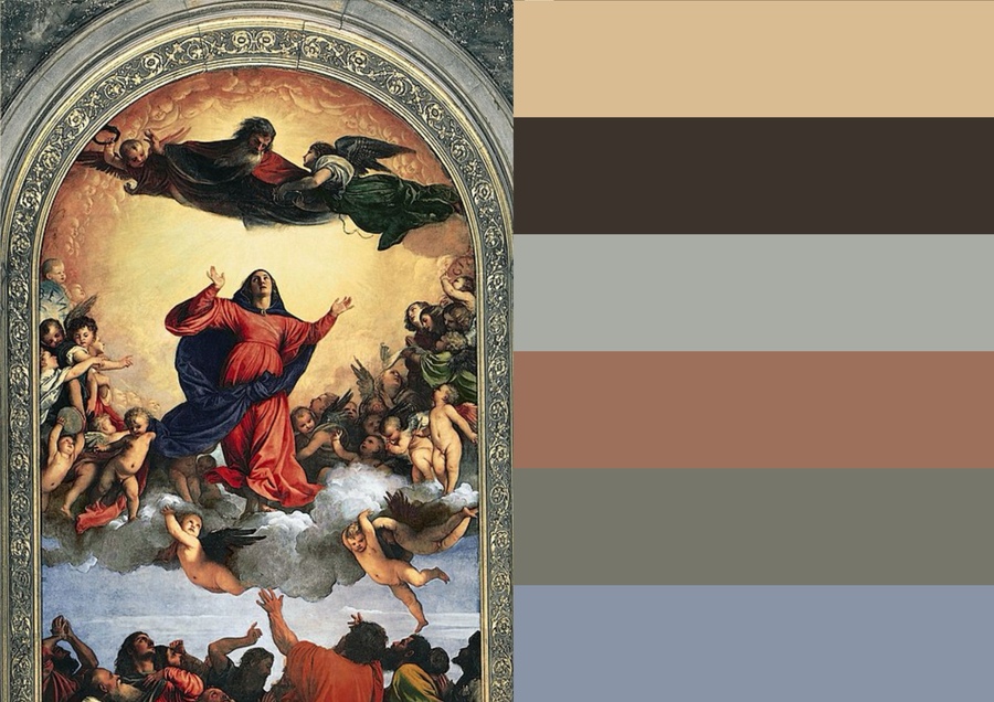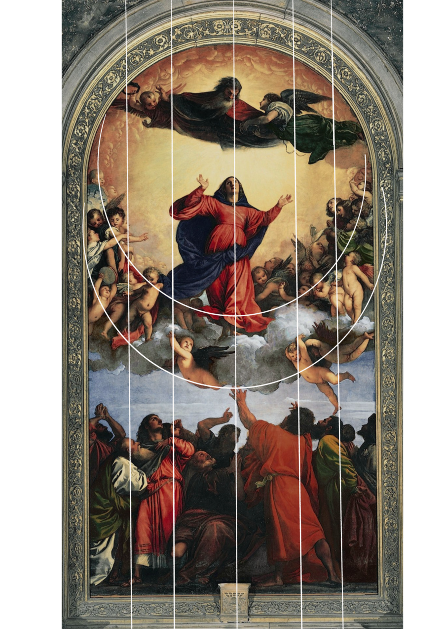 В «Вознесении Девы Марии» композиция построена на вертикальном движении, объединяющем земной и небесный миры. Тициан создал монументальную композицию, полную драматизма и динамики: движение Марии вверх, устремленные к ней руки апостолов, сияние Бога-Отца сверху создают не геометрическую схему, а единый вихрь, где форма рождается из энергии мазка и цвета. Цветовое решение только усиливает эмоциональное воздействие. (религиозный и духовный мотивы).