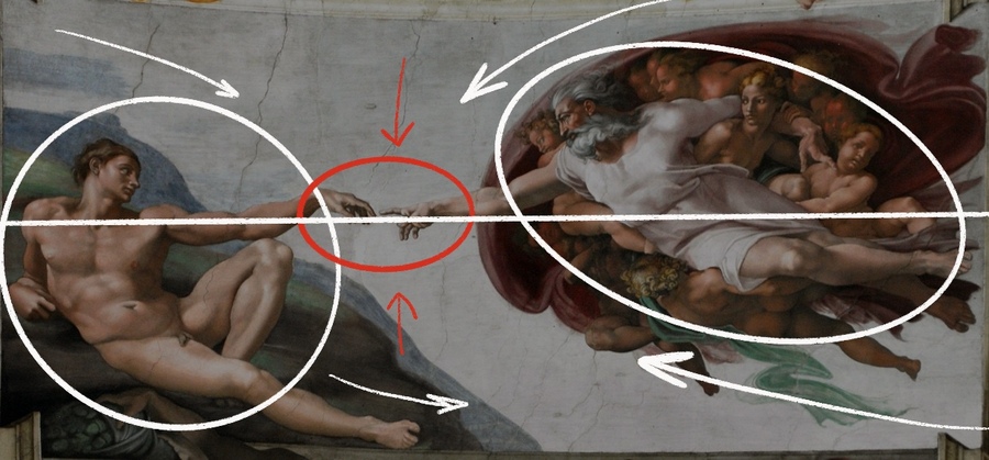 • Микеланджело в «Сотворении Адама» строит динамичную композицию на встречном движении двух энергий (объектов), где пустое пространство между пальцами становится композиционным центром: драматичная и геометричная композиция строится на контрастах инертной масс тела Адама и динамичного, несущегося в облаках Бога-Отца. Титанические фигуры выражают мощь происходящего действия, эмоции передаются через напряжение мускулатуры и экспрессию жестов.