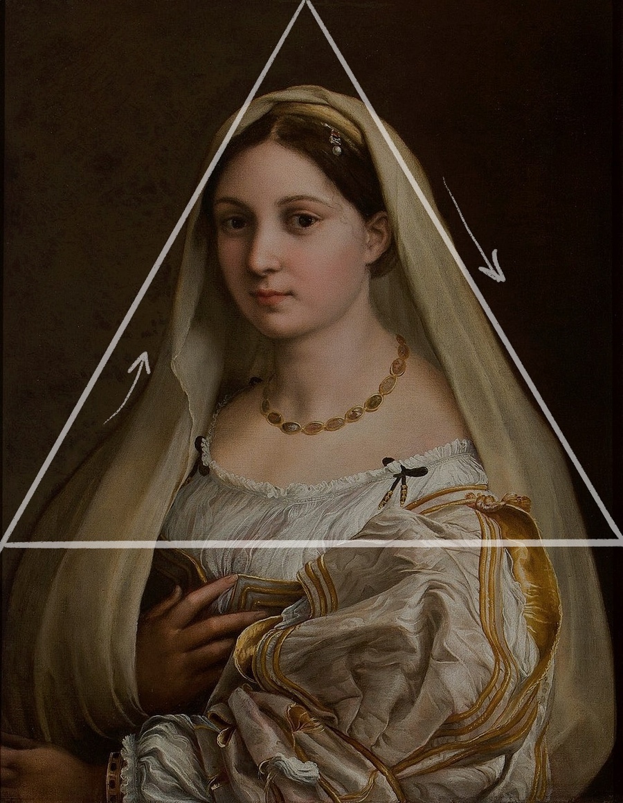 В «Донне Велате» простая и устойчивая пирамидальная композиция, характерная для портретов. Мастер создает образ совершенной женственности, где эмоции передаются сдержанно и благородно, что соответствует представлению о возвышенной гармонии.