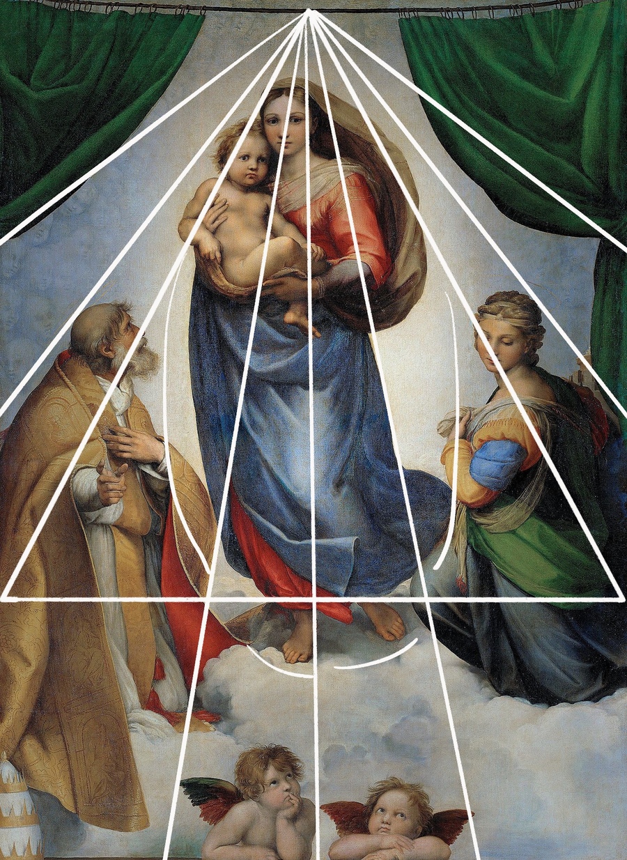 В «Сикстинской Мадонне» мастер использует треугольную композицию, создающую ощущение возвышенности. Образ Мадонны сочетает величие и человеческую нежность.