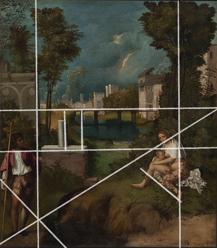 • Джорджоне в «Буре» создает новаторскую композицию, где смысловой центр смещен. Асимметричное построение создает ощущение мгновенности и случайности.