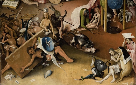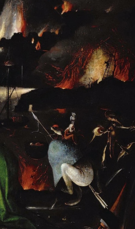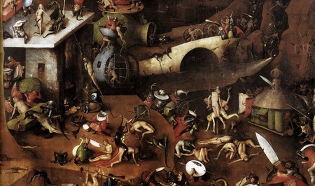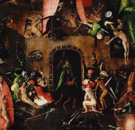 Земной мир становится схож в иконографии Босха с адом. Центральная створка — это не сцена суда, а полнейший ужас конца света. На землю вторглись демоны, превратившие и её в ад. Цвета художник тоже выбирает приближенные к преисподней.