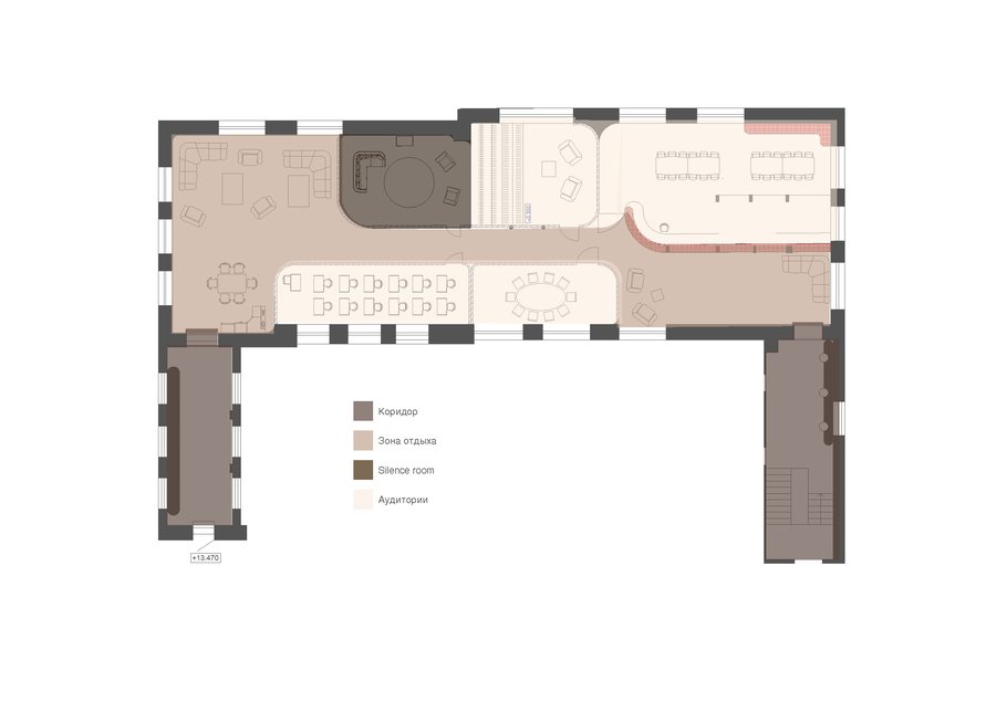 Студенты хотели бы, чтобы учебное пространство включало: макетную зону, тихую комнату (silence room), кухонную зону (coffee point), удобные места для хранения личных вещей, зону отдыха, конференц-зал.