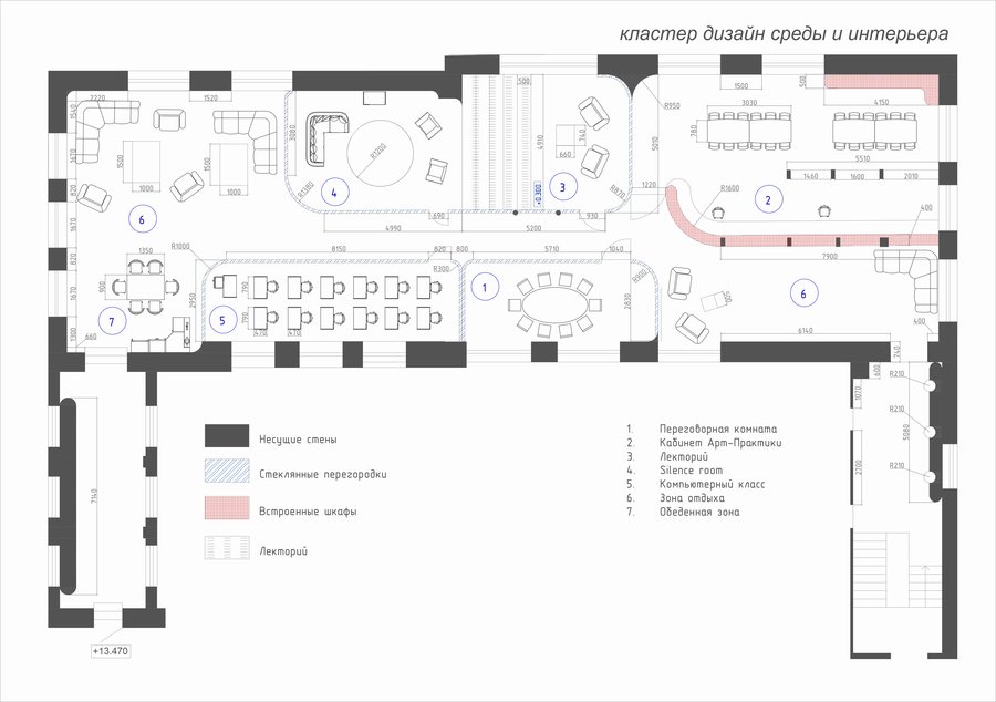 Разработать современный интерьер учебного пространства и индивидуального рабочего места, соответствующий актуальным тенденциям и принципам эргономики.