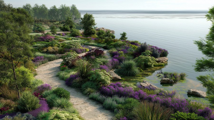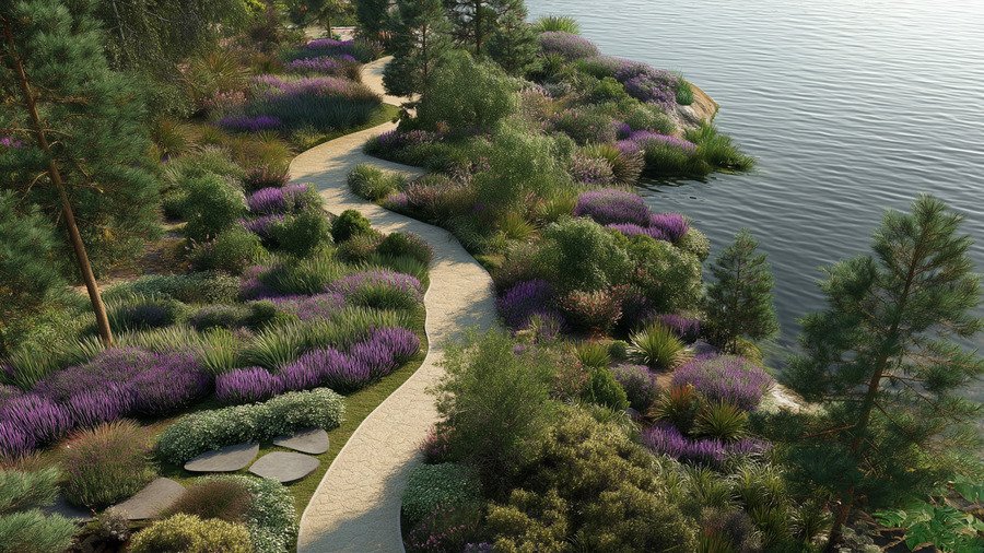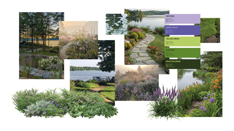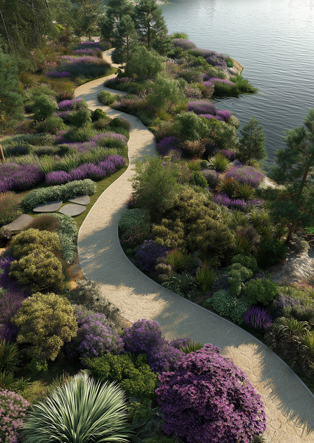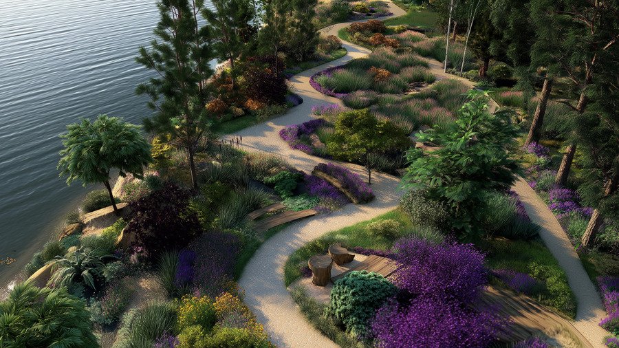 Пространство, которое плавно стекает вдоль берега Оки, соединяя землю и воду в единую гармонию. Сад создает ощущение живого потока, где каждый изгиб дорожки и каждое растение перетекают друг в друга, словно движение воды. Река, величественно раскинувшаяся на фоне сада, не просто присутствует, а становится естественным продолжением ландшафта и сад словно движется к ней, растворяясь в её спокойных водах.