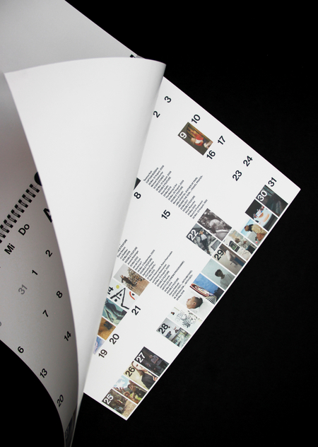 Я решила разработать ретроспективный календарь, который бы объединял все прошедшие в галерее выставки (более 300). В качестве основы для построения календаря используется прямоугольная сетка, которая меняется в зависимости от количества прошедших в этом месяце выставок. Подобная адаптивность освобождает пространство листа, даёт возможность для дополнительных подписей и аннотаций, а также продолжает метафору встраиваемости.