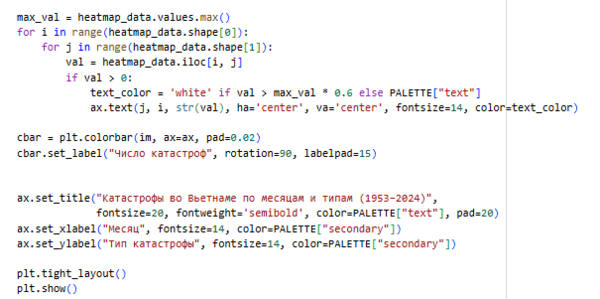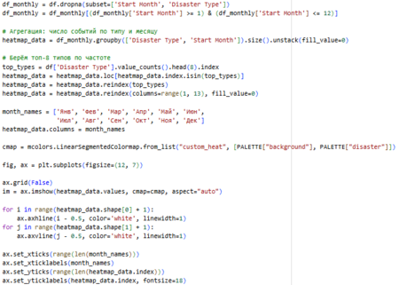 Строим тепловую карту, показывающую распределение числа катастроф по месяцам и типам. Каждая ячейка отражает частоту событий: чем темнее цвет, тем больше катастроф. График наглядно выявляет сезонность: например, тайфуны и наводнения чаще происходят с июля по ноябрь, что соответствует муссонному сезону во Вьетнаме.