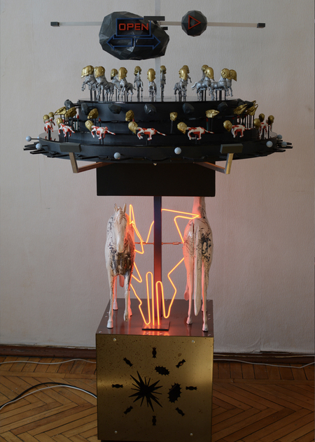 Pandemic Chronotope is a web project and installation combining digital animation with traditional Russian illustration to create a story made from personal anecdotes about the impact of Covid-19 on daily life. During a period of national lockdown in 2020, Russian artist and UX designer Mariia Fedorova solicited submissions from the general public about their experiences, spinning them into chapters of the Firebird fairy tale, thus trying to comprehend the rules of the new world. Thе installation brings the finale of that story to life using a three-dimensional zoetrope, a kind of pre-cinema animation device, further reinforcing the interplay of historical and contemporary forms of storytelling and simulation within the work.