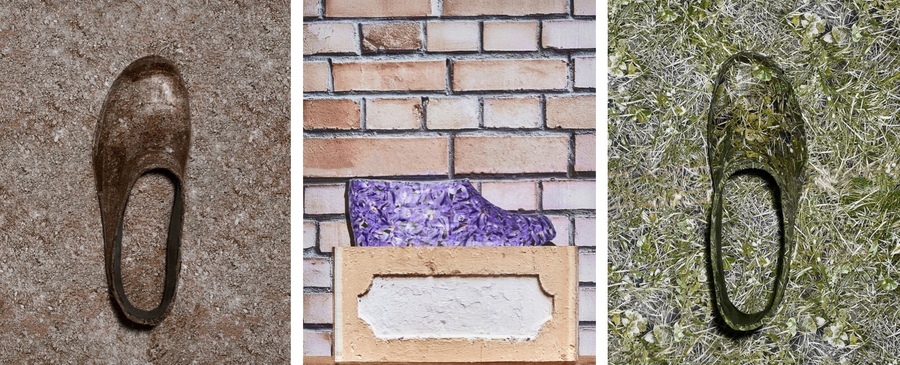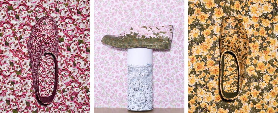 Проект «Пересажено» посвящен подмене понятия природы в современном мире. «В серии цветы копируют, печатают, пересаживают на предметы. всё вокруг живое, но ненастоящее. Галоши-объект, на который пересажен принт».
