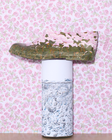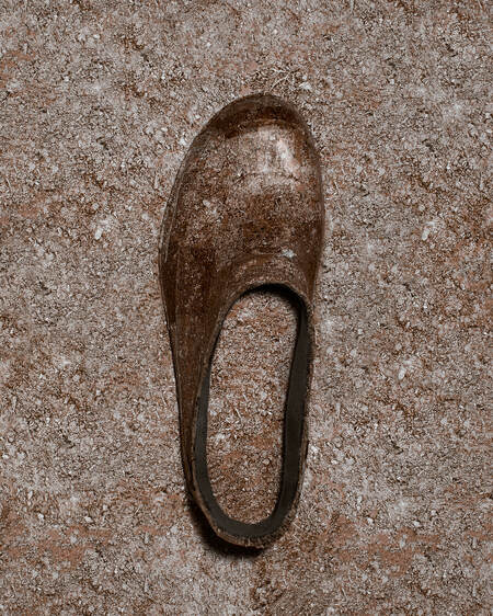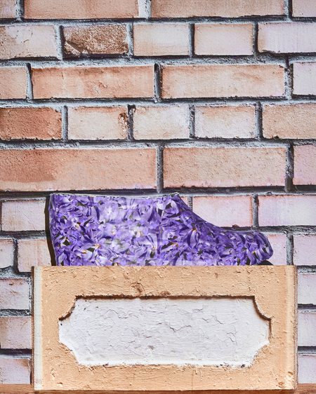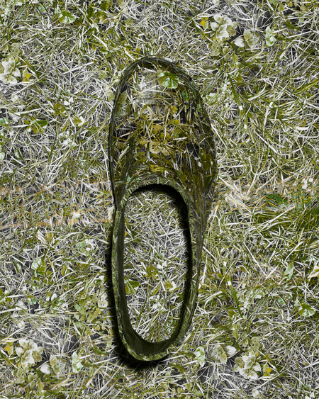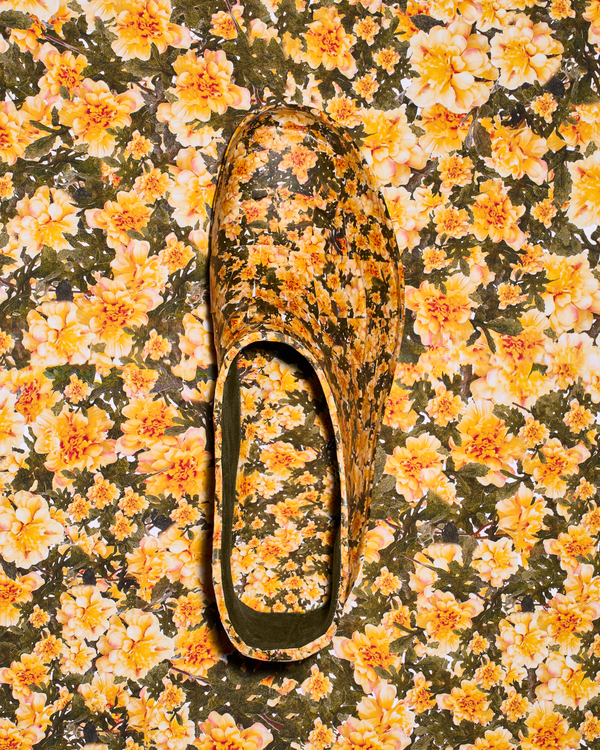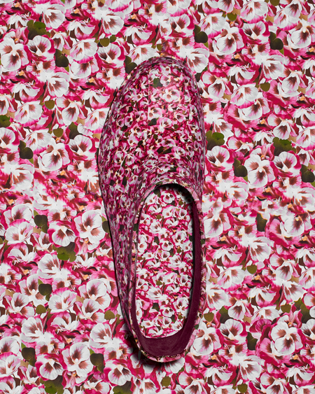 Человек подменяет природу визуальными копиями: принтами, пластиком, «зелеными» материалами без жизни. В серии цветы копируют, печатают, пересаживают на предметы. Все вокруг живое, но ненастоящее. Галоши становятся частью этой системы, объектом, на который пересажен принт.