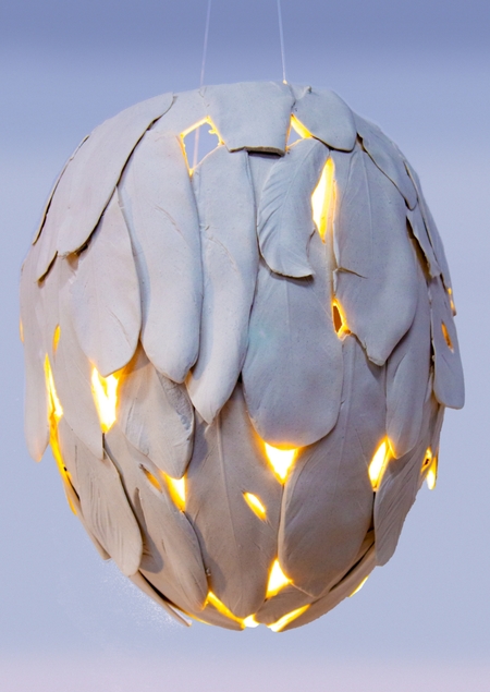 Фарфоровый светильник, вдохновлённый мягкостью и нежностью пера и контрасте с твердостью и звонкостью материала. Собранный из ажурных перьев, он создает атмосферу комфорта и умиротворения, будто заворачивает в мягкий теплый кокон.