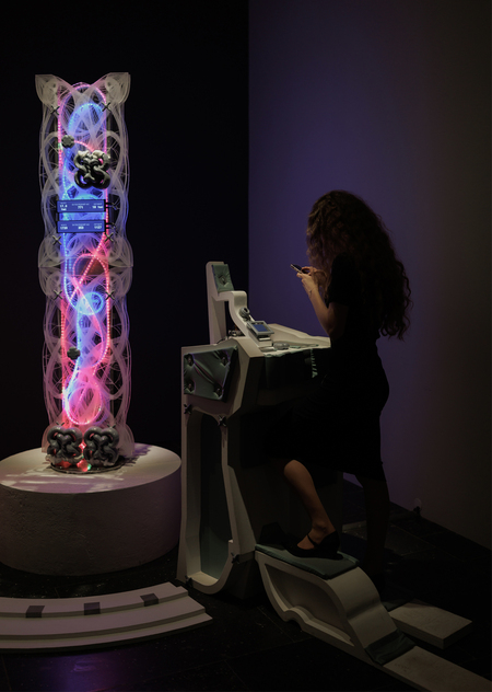 Инсталляция состоит из двух футуристичных тумб и центрального светящегося объекта. Тумбы отдалённо напоминают эргономичную мебель для работы за компьютером и служат активатором центрального объекта, символизирующего ИИ. Человек активирует инсталляцию своим телом, приняв положение на тумбе, следуя выделенным позициям для рук и ног. Центральный объект ‘считает’ количество «прикосновений» за последний час и за все дни работы выставки, выводя статистику на вытянутые экрана. Если количество прикосновений за последний час меньше 20, то объект окрашивается в синий, демонстрируя неготовность к взаимодействию. Если больше — загорается красным и начинает «отвечать»: на экране тумбы появляется индивидуальное послание для посетителя.