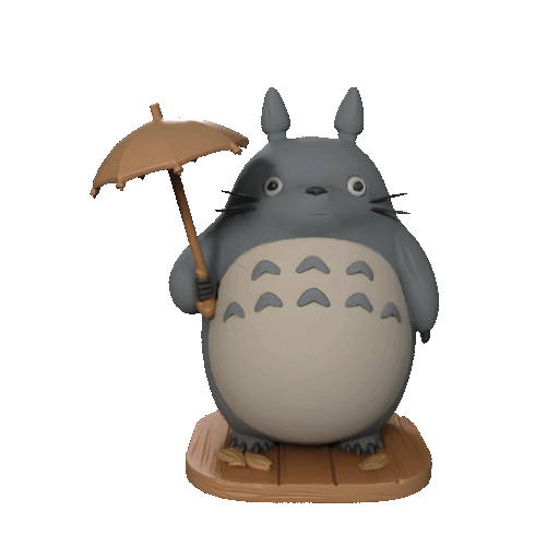 Totoro standing upright holding a simple umbrella with both hands. Large rounded body, soft proportions, short arms and legs, calm friendly expression. Surface looks like matte painted plastic or resin, smooth and slightly soft appearance. Static pose, no dynamic motion. Decorative collectible figurine designed for interior display, studio lighting. High quality stylized 3D product render, collectible interior object, matte surface, soft studio lighting, neutral warm background, gentle shadows, minimalist composition, suitable for 3D printing.