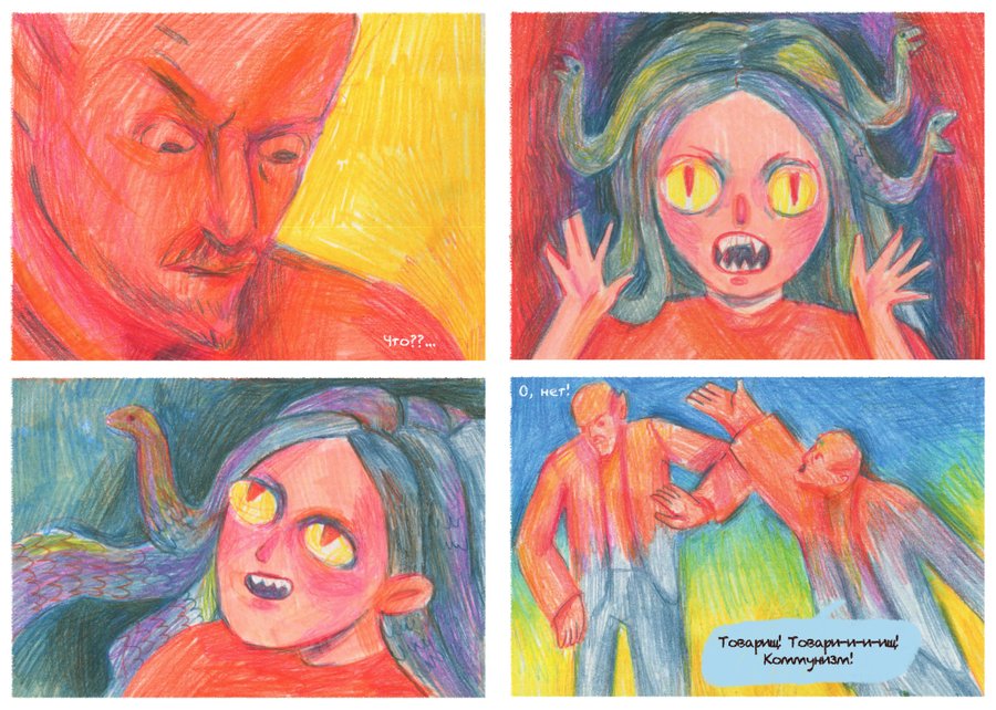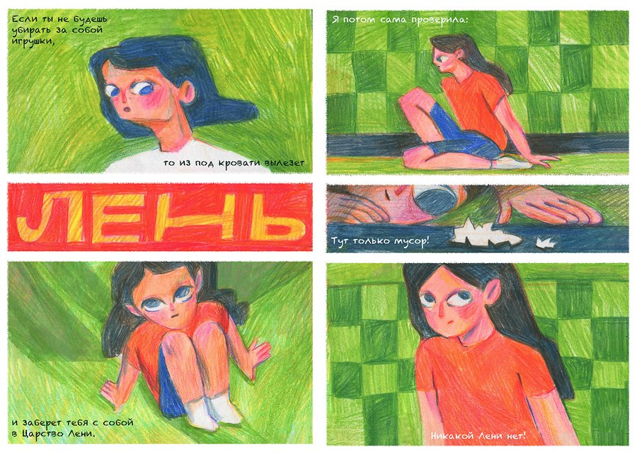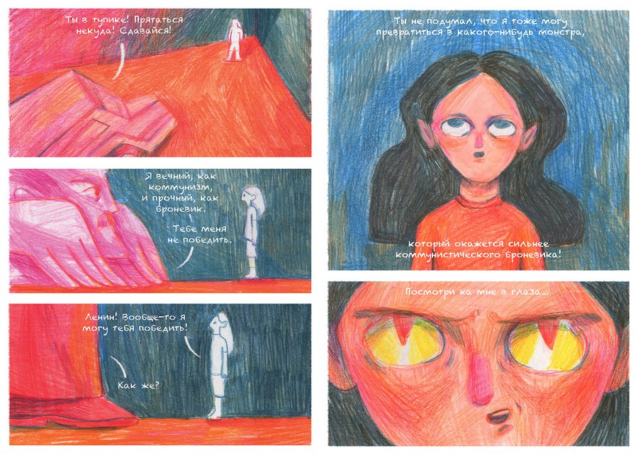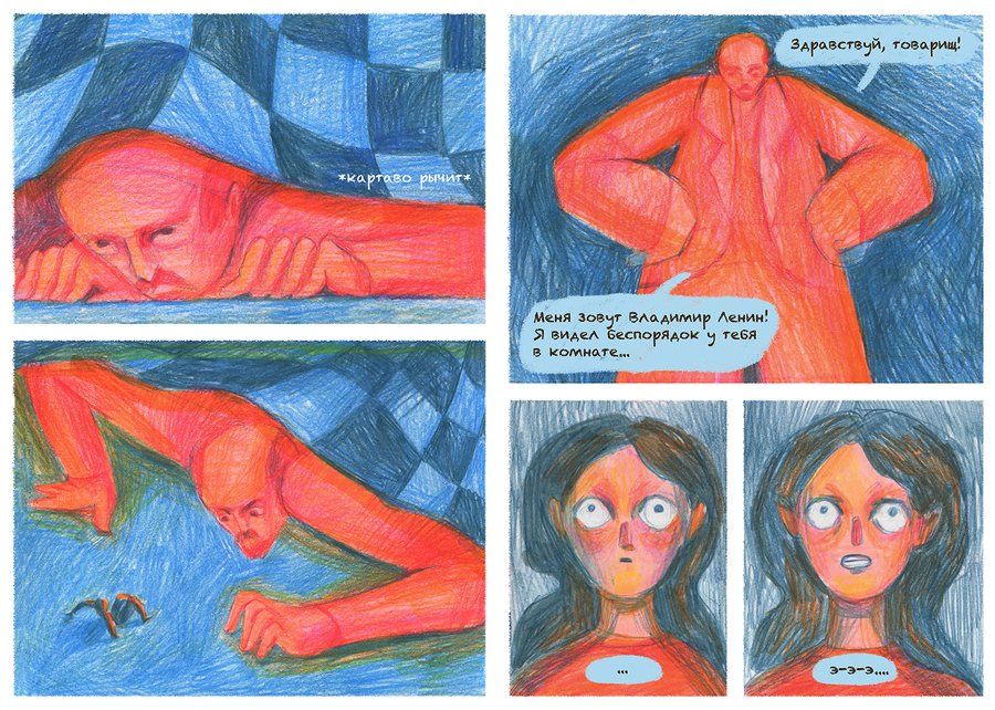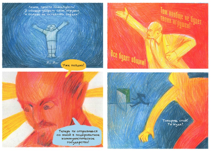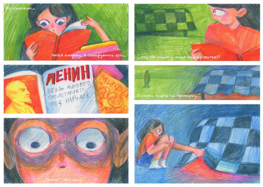Однажды мама сказала мне, что если я не буду убирать за собой игрушки, то из-под кровати вылезет Лень и заберет меня с собой в подкроватное царство. Я не поверила истории, к тому же — под кроватью я никого не обнаружила. Как-то раз, листая историческую книжку, я натыкаюсь на портрет Ленина и понимаю: это он сидит у меня под кроватью. С этого момента начинается моя борьба с подкроватным монстром Лениным.