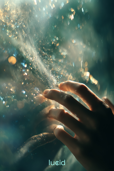 Промт для генерации справа: photorealistic macro shot, a close-up of a hand gently touching a concrete wall covered in dozens of scattered light caustics. The fingertip makes contact with one specific, intensely bright sunspot, causing it to glow more vibrantly than the others, in colors of sunny yellow (F2E852) and pale sand (F2CA7E). The other light patterns on the wall glow softly in mint green (A0F2EA) and steel blue (C1D4D9). Shallow depth of field, extreme focus on the connection between the finger and the highlighted sunspot. The atmosphere is one of delicate discovery and focus. Shot on 35 mm film, sharp details.