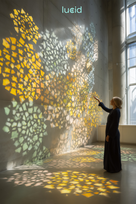 Промт для генерации слева: photorealistic, a bright, airy minimalist interior with light gray concrete walls flooded with soft, natural light. A large, complex network of vibrant, luminous patterns is projected onto the wall, glowing intensely in colors of sunny yellow (F2E852), pale sand (F2CA7E), and mint green (A0F2EA). A woman in a dark dress stands in profile, her silhouette defined against the bright glow. Her arm is extended, her fingers gently touching the light pattern. The light gray floor reflects the projection, amplifying the light. The atmosphere is one of serene, intellectual discovery and clarity. Clean, bright studio lighting, cinematic, shallow depth of field.
