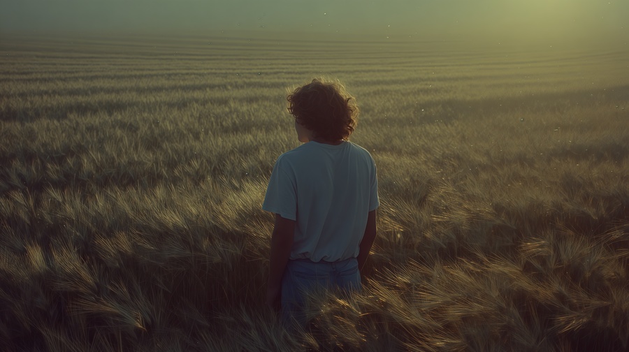 Промт: photorealistic, a teenage boy seen from behind, standing in a vast field of golden rye at dawn. The morning sun is low, casting a soft, warm, and hazy light. The light creates shimmering, caustic patterns on the rye in colors of pale sand (F2E852), and mint green (A0F2EA). The atmosphere is melancholic, serene, and liberating. Small pollen particles float in the air. Cinematic, wide shot, shot on 35 mm film, grainy