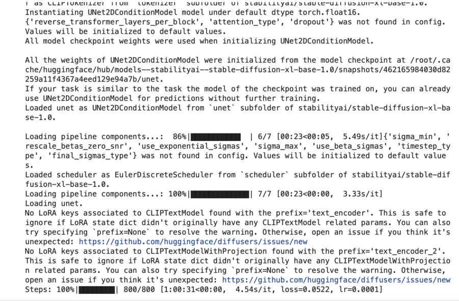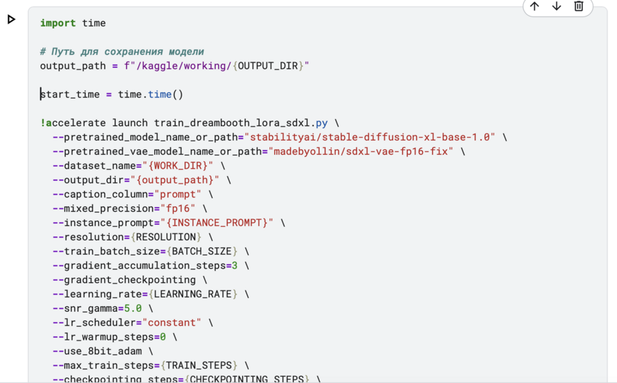 Я обучала модель Stable Diffusion XL методом DreamBooth + LoRA. Поставила среднее разрешение — 512p, чтобы обучение длилось не так долго, поставила шаги 800, а сохранение каждые 250 шагов.
