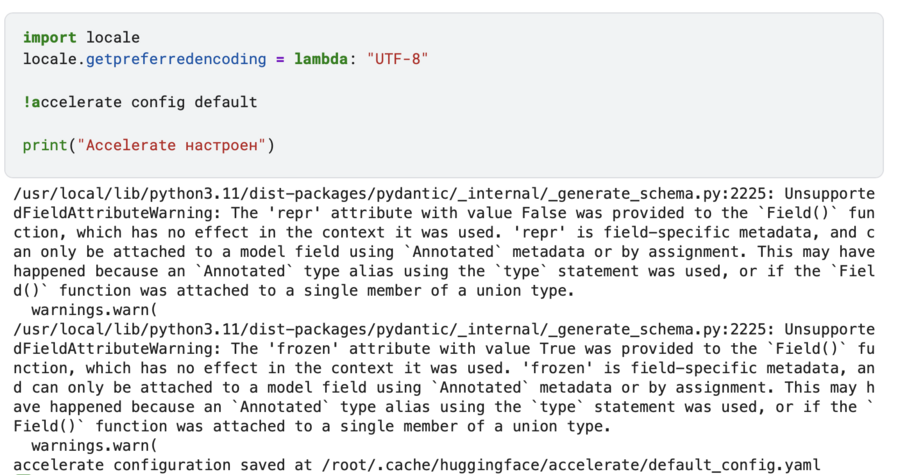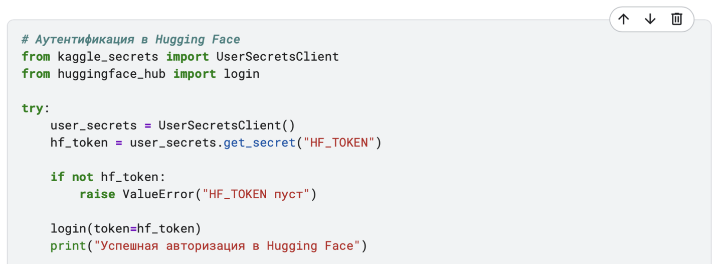 Потом нужно было настроить Accelerate. После этого шага я зарегистрировалась в Hugging Face и прошла верификацию, чтобы подключить токен. Этот токен нужно было добавить через Kaggle Secrets.