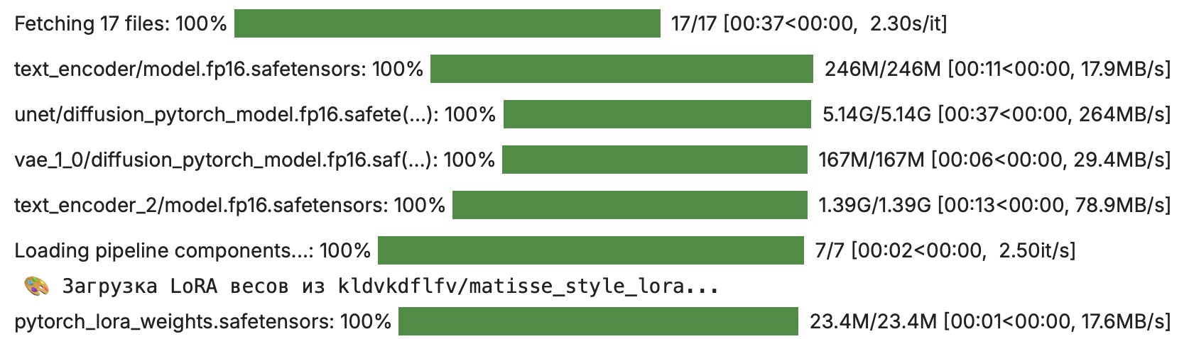 Модель со стилем Матисса была успешно загружена, теперь я могу использовать ее командой: pipe.load_lora_weights («kldvkdflfv/matisse_style_lora»)