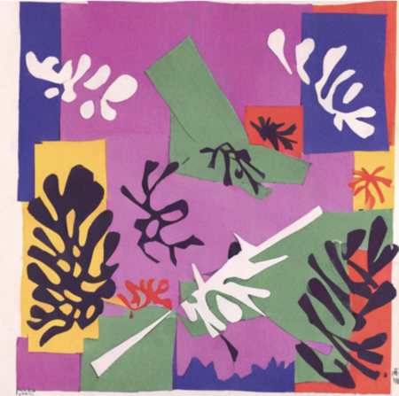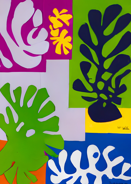 2. Работы в технике paper cutouts Матисса с чёткими контурами, плоскими гуашевыми цветами и модульными формами идеальна для обучения, так как позволяет легко сегментировать, анализировать и генерировать вариации без потери выразительности. По этой причине приоритет работам периода 1940-1954.