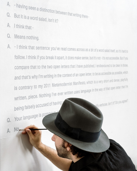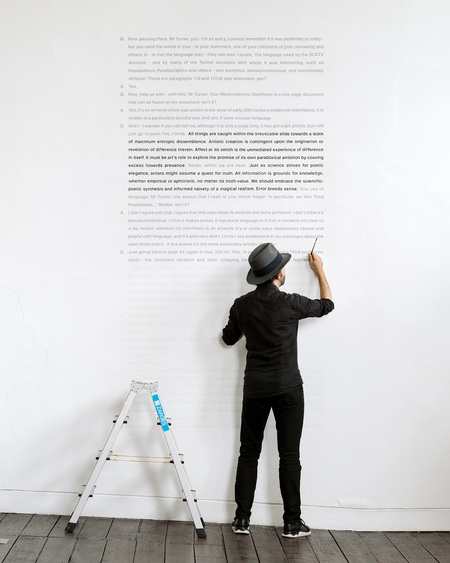 Проект Люка Тернера 2025 года: настенная текстовая работа и одновременно перформанс. Тернер в течение 28 дней собственноручно наносил текст на стены галереи графитом и акрилом по эмульсионной краске, работая «вживую» на лестнице и параллельно общаясь с посетителями. Автор стыкует фрагменты своего Metamodernist Manifesto 2011 года с репликами из судебного разбирательства, где этот манифест был зачитан в суде в попытке доказать «несвязность» его работы и связать её с академическим антифашистским текстом, ошибочно приписанным художнику. В экспликации Beaconsfield подчёркивается, что текст строится как обмен репликами — своего рода драматургия перекрёстного допроса, где художественное высказывание становится объектом юридической риторики. С точки зрения собственной метамодернистской теории Тернера, проект можно читать как саморефлексивный эксперимент над манифестом: его положения об осцилляции и «информированной наивности» буквально проходят испытание перекрёстным допросом и остаются «в силе» после юридической проверки. Одновременно длительное физическое письмо текста на стене, разговоры с публикой и включённость в экологически и институционально ориентированный проект «Manifesto for Sustainable Experimentation» укладываются в линию работ, где художник исследует, как манифесты могут существовать не только как теоретические PDF‑файлы, но и как живые, уязвимые, телесно переживаемые формы в пространстве искусства.