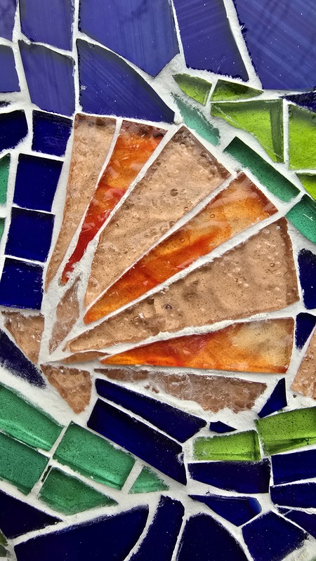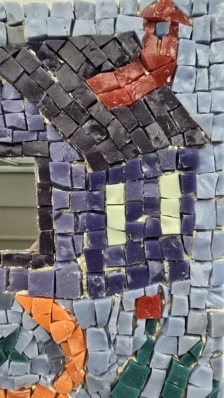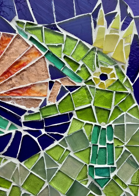 Мозаика «Щука» размером 15×15 см выполнена из витражного стекла разного цвета.