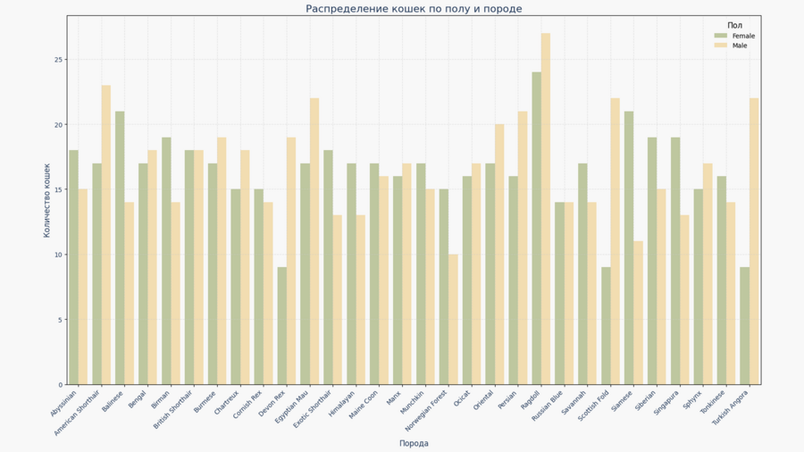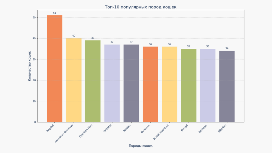 Для следующей диаграммы использован метод подсчёта частот (количество кошек каждой породы), данные визуализированы в виде столбчатой диаграммы, где высота столбца отражает популярность породы. Также применён метод ранжирования — породы отсортированы по убыванию, что позволяет быстро выделить лидера и менее популярные варианты.