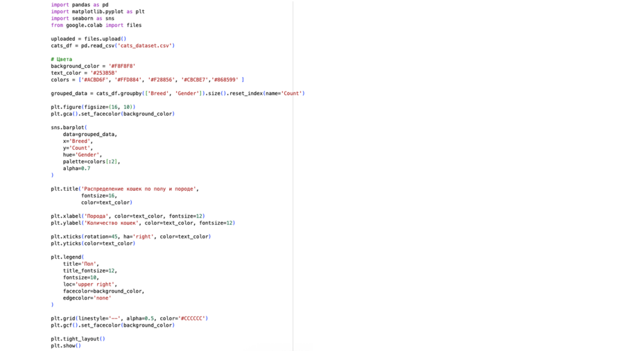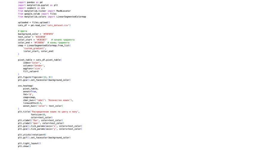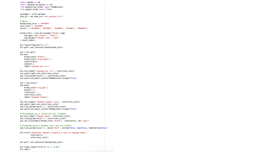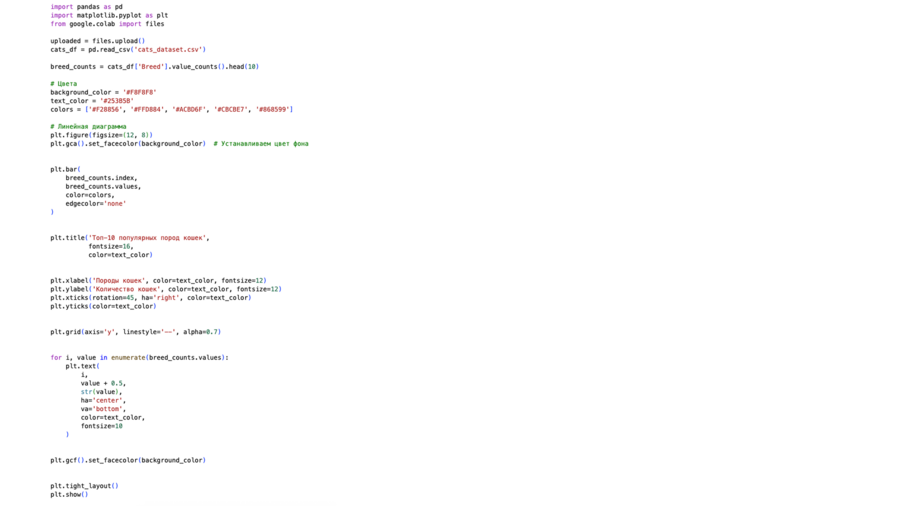 Использование Python для построения диаграмм в данном исследовании показало высокую эффективность благодаря гибкости языка и библиотек pandas, которые позволили создать информативные визуализации и настраивать дизайн и цветовую схему. Такой подход дал возможность не только наглядно представить статистические данные о кошках, но и провести разного рода расчеты.