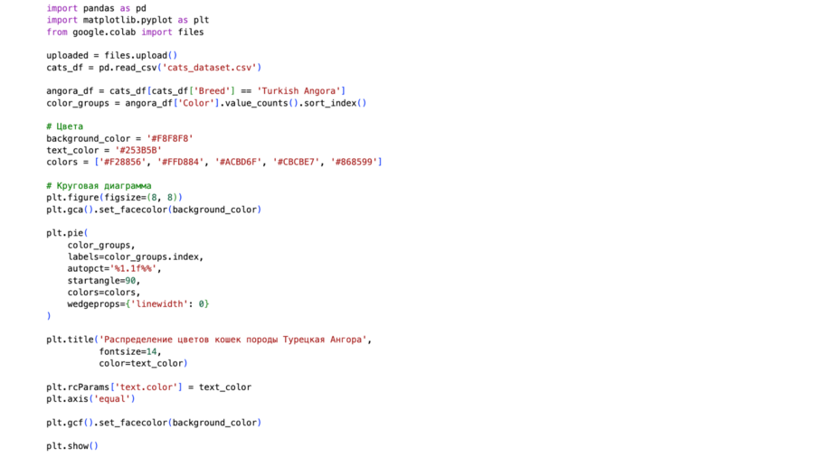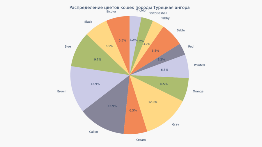 Для построения круговой диаграммы был использован метод расчёта процентного соотношения каждого цвета кошки породы Ангора. Далее была сделана визуализация, где каждая часть круга показывает, сколько процентов кошек существует определённого цвета.