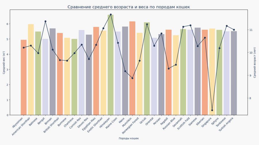 На диаграмме использованы методы расчёта среднего веса в виде столбчатой диаграммы и среднего возраста в виде линейного графика по породам кошек. Данные разделены по породам, что позволяет сравнить характеристики разных групп.