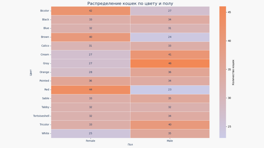 В тепловой диаграмме использованы методы подсчёта количества кошек каждого окраса по полу и метод сравнительного анализа. Данные сгруппированы по цвету шерсти и разделены на категории самки/самцы. Визуализация выполнена с помощью цветовой кодировки.