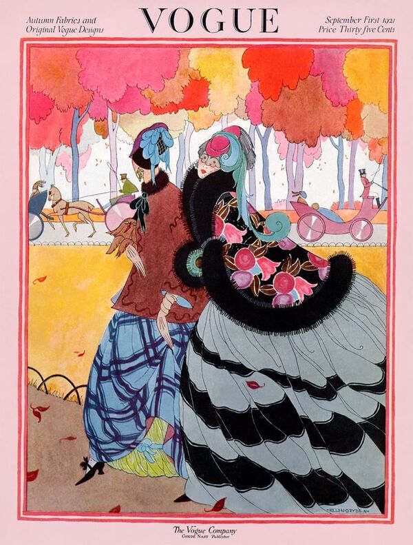 На обложке Vogue 1921 года все наоборот: две дамы просто гуляют по бульвару, их широкие силуэты и вычурные элементы образа превращают прогулку в манифестацию стиля: здесь свобода понимается как возможность распоряжаться временем и жить в эстетике большого города.