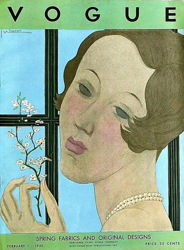 На обложке Vogue тоже крупный женский портрет, но в рисованной манере. Черты лица сглажены, шея вытянута, кожа идеальная, на шее жемчужное ожерелье, в руке тонкая веточка с цветами. Вместо следов работы мы видим гладкость и хрупкость, а вместо производственного фона — голубое окно.