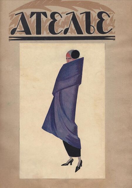 Обложка журнала «Ателье» показывает фигуру женщины, почти полностью завернутой в длинное пальто или плащ. Силуэт вытянутый, ноги в узких туфлях на каблуке, голова в геометрической шапочке. Фон пустой, из деталей только шапка и плащ, которые превращают фигуру в чистую форму, что подчеркивает собранность и незначительную отстраненность женщины: так, в этом образе важнее не место и сюжет, а сам силуэт и линия одежды, что в какой-то степени выдает некую параллель с тенденциями изображения в западных журналах, однако, в отличие от них, здесь в значительной степени акцент смещается с потенциального окружения героини.
