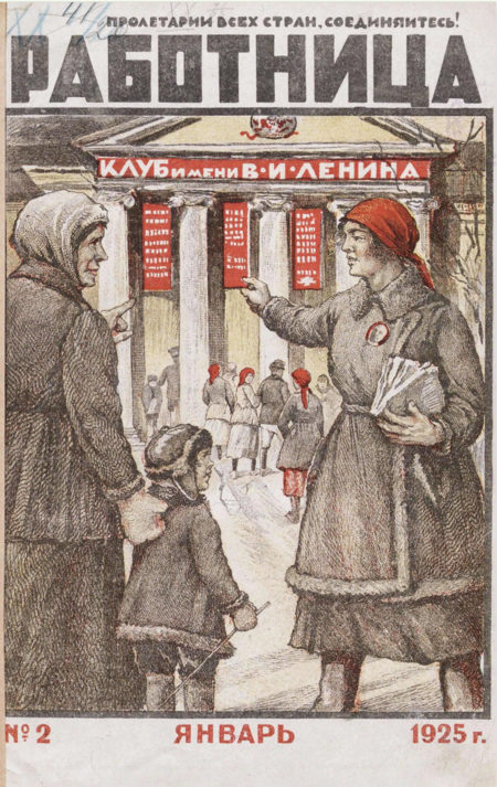 На обложке «Работницы» 1925 года женщина действует не в одиночку, а внутри небольшого коллектива. Молодая активистка у входа в клуб им. Ленина показывает афиши и списки занятий старшей женщине и ребёнку, как будто вводит их в новое пространство чтения, лекций и просвещения. Здесь «новая женщина» — не просто образованная, а та, кто помогает другим войти в общий культурный процесс. Пространство вокруг организовано через архитектуру клуба, колонны, афиши — всё это подчёркивает идею общественного места, куда женщина приходит не отдыхать, а учиться и учить, что коррелирует с советским нарративом.