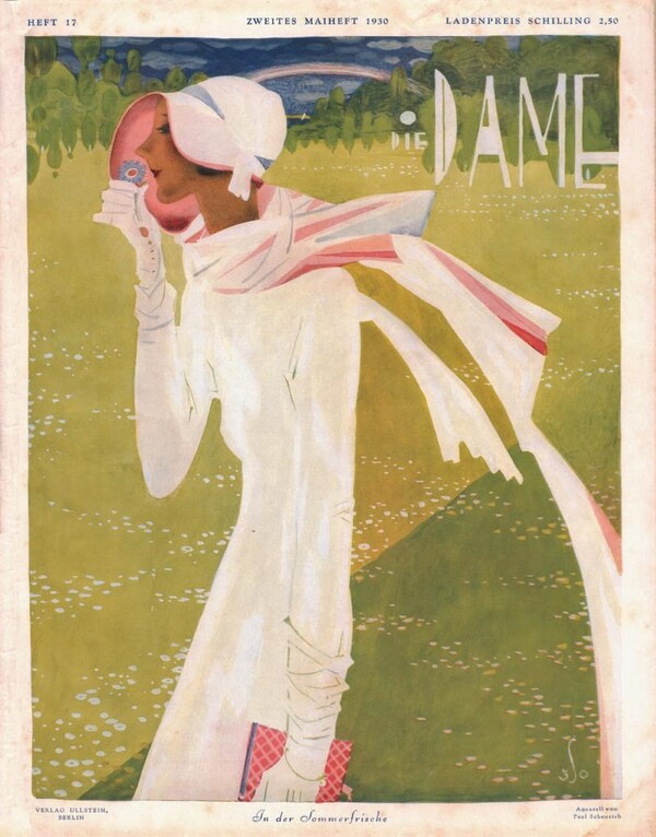 На обложке Die Dame 1930 года логика иная: женщина изображена одна, в движении, на фоне открытого зеленого пространства. Она держит зеркальце, поправляет шляпку или проверяет макияж — в любом случае это жест, направленный на себя, а не на других. Пейзаж напоминает прогулку или отдых, и фигура не зовёт никого за собой, а просто живёт в собственном темпе, что подчеркивает превалирующий тренд на индивидуализм.