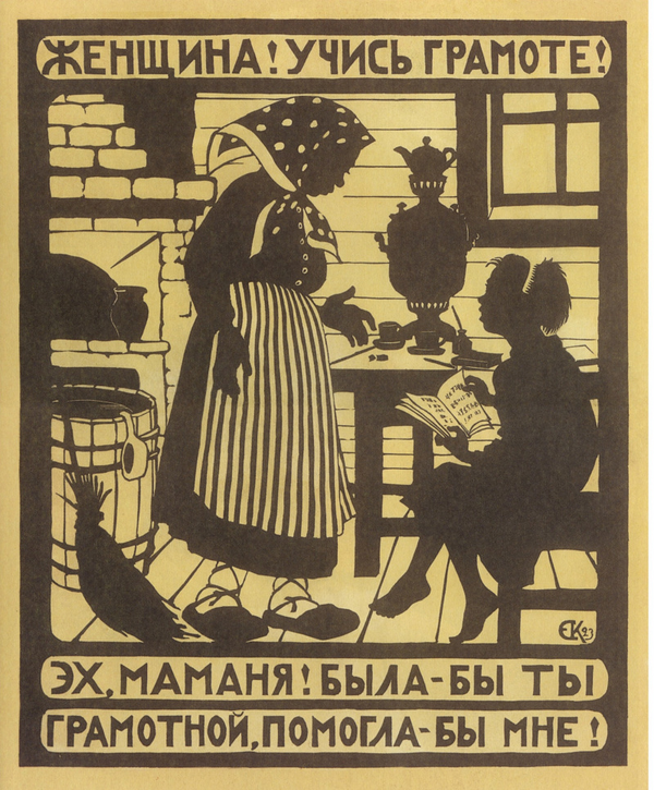 В плакате «Женщина! Учись грамоте!..» быт показан как ограничивающая среда: темная изба, утилитарные вещи, контраст между читающей девочкой и неграмотной матерью. Здесь «новая женщина» задаётся через необходимость преодолеть неграмотность и выйти из традиционного уклада.