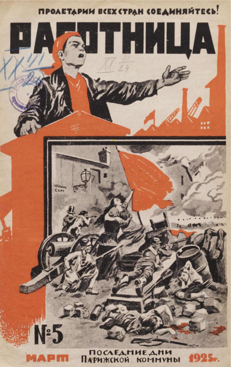 Обложка «Работницы» № 5 за 1925 год показывает женщину у трибуны, с поднятыми руками, на фоне заводских труб и красного флага. Мало цветов, жесткий контраст, тело напряжено — можно сказать, это образ политического субъекта и участницы революции, а не «красиво одетой» героини.