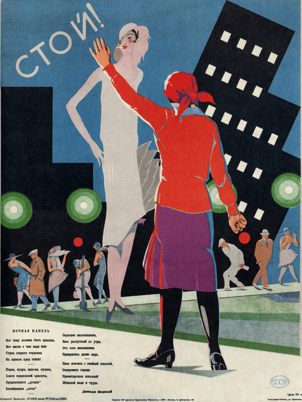 Так через очень похожий приём — одинокую женскую фигуру на фоне города — советская и западная визуальная культура показывают две разные версии «новой женщины»: активную гражданку и дистанцированную, но модную горожанку.
