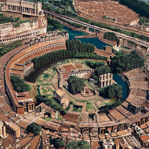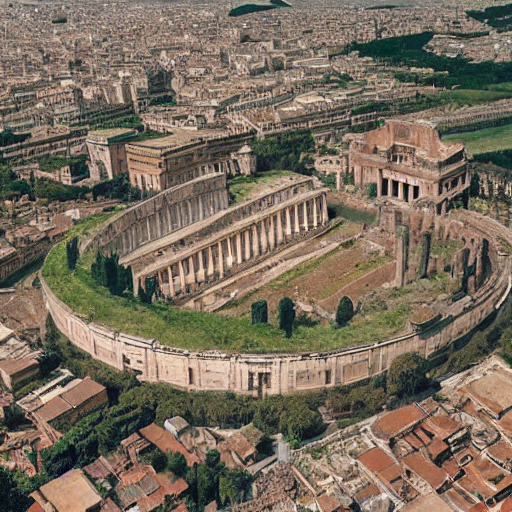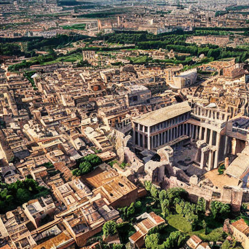 «A stunning aerial view of Rome’s ancient ruins blending into the modern cityscape, ultra-detailed textures»,