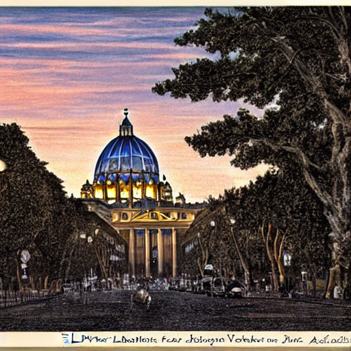 «The Vatican at sunset, St. Peter’s Basilica illuminated with soft golden light, detailed historical buildings»,