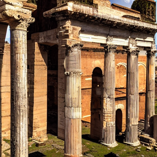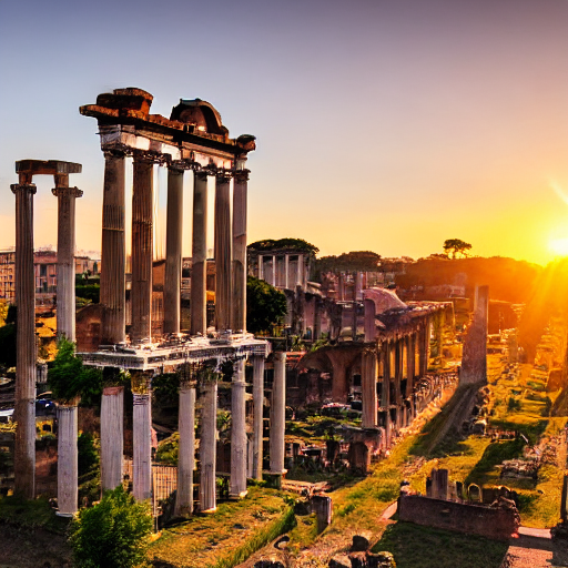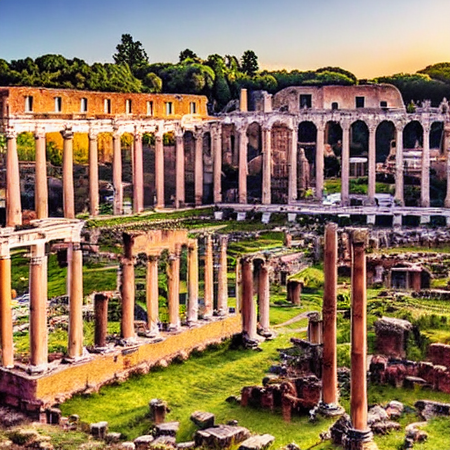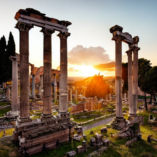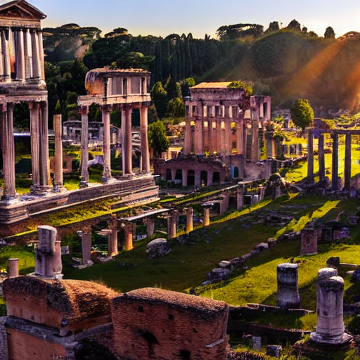 «A breathtaking view of the Roman Forum at dawn, sun rays lighting up the ruins, high realism, 8k quality»,