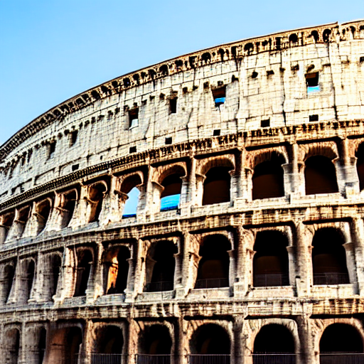 «The majestic Colosseum standing tall under a clear sky, sharp contrast of light and shadow, realistic architecture»,