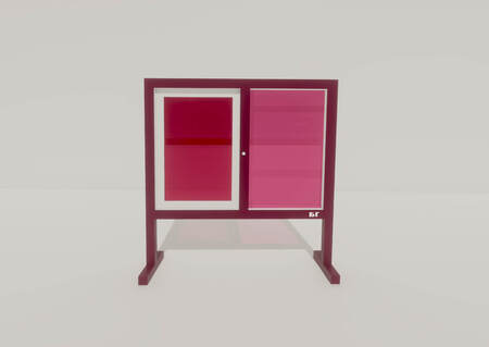 рама: алюминий или МДФ, покраска порошковая; стекло: акрил 6-8 мм (pink rose / blush / light magenta); подсветка: LED-лента по контуру; крепеж для уличных условий; сменные бренд-панели.