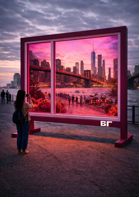 1. Розовое акриловое стекло Матовый или лёгкий градиент «розовое шампанское». Создаёт эффект живого фильтра Instagram / VSCO, но в офлайне. -Фотогенично, работает и днём, и ночью с подсветкой. 2. Брендированная рамка Белый или тёплый чёрный металл/МДФ с логотипом BG.RU. Интегрированная подсветка по периметру. QR-коды на сайт и Telegram. 3. Модульность Можно использовать 1, 3, 5 рам для разных площадок. Возможность выстроить дорожку из «окон» как путь открытия города. Легко перевозится: каждая рамка — отдельный модуль. 4. Смысловой акцент - На каждой рамке короткая фраза: «Смотри на город по-новому» «Здесь начинается Большой Город» «Город ближе, чем кажется» «Увидь историю»